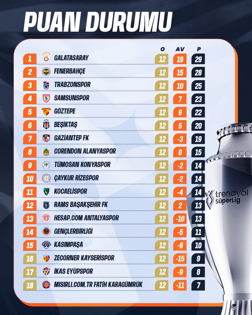 Spor Trendyol Süper Lig’de 12. hafta maç sonuçları ve puan durumu Yazar: Zirvem Gazetesi Kasım 10, 2025 Yazar: Zirvem Gazetesi Kasım 10, 2025 0 Yorumlar 0 Dakika Oku Paylaş 0FacebookTwitterPinterestTumblrVKWhatsappEmail 308 Trendyol Süper Lig’de 12. haftanın maçları tamamlandı. Trendyol Süper Lig’de 12. hafta maçlarının ardından oluşan puan durumu. Trendyol Süper Lig 12. Hafta Maç Sonuçları ve Puan Durumu Paylaş 0 FacebookTwitterPinterestTumblrVKWhatsappEmail Zirvem Gazetesi Önceki Haberler Kubilay Muhammet Özdemir’in 10 Kasım Atatürk’ü Anma Mesajı next post Cumhurbaşkanı Erdoğan, Azerbaycan dönüşü uçakta gazetecilerin sorularını yanıtladı Ayrıca Bu Haberlerede Bakabilirsiniz Bizim Çocuklar Dünya Kupası’nda Nisan 1, 2026 Türkiye, Dünya Kupası hasretini bitirmeye çok yakın Mart 30, 2026 Türkiye’nin Romanya galibiyeti dünya basınında Mart 28, 2026 Türkiye, 2026-2027 sezonunda UEFA organizasyonlarında 5 takımla yer alacak Mart 25, 2026 IFAD’ın “İlk Adım” devrimi Afrika’nın gıda geleceğini güvence altına alabilir mi? Mart 4, 2026 A Milli Basketbol Takımı, 2027 Dünya Kupası Avrupa Elemeleri’nde Sırbistan’ı yenerek 3’te 3... Şubat 28, 2026