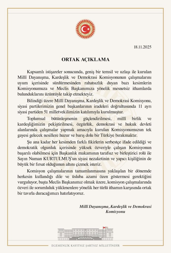 Öne Çıkanlar Millî Dayanışma, Kardeşlik ve Demokrasi Komisyonu 17’nci toplantısında Yazar: Zirvem Gazetesi Kasım 19, 2025 Yazar: Zirvem Gazetesi Kasım 19, 2025 0 Yorumlar 2 Dakika Oku Paylaş 0FacebookTwitterPinterestTumblrVKWhatsappEmail 83 TBMM Resmi X Hesabından yapılan açıklamaya göre: Millî Dayanışma, Kardeşlik ve Demokrasi Komisyonu, 18 Kasım 2025 Salı günü TBMM Başkanımız Sayın Numan Kurtulmuş’un başkanlığında TBMM Tören Salonu’nda toplanmıştır. Komisyonun 17’nci toplantısında, TBMM Başkanımız açılış konuşması yapmış, kapalı gerçekleşen bölümde ise İçişleri Bakanı Sayın Ali Yerlikaya, Millî Savunma Bakanı Sayın Yaşar Güler ve Millî İstihbarat Teşkilatı Başkanı Sayın İbrahim Kalın sunum yapmış ve milletvekillerinin soruları yanıtlanmıştır. Toplantının açık yapılan kısmında, son dönemde siyasi nezaket ve üslupla bağdaşmayan bazı söylemlere karşı Milli Dayanışma, Kardeşlik ve Demokrasi Komisyonunun ortak açıklama metni okunmuş ve oylanarak ittifakla kabul edilmiştir. Komisyon, bugüne kadar gerçekleştirdiği çalışmaları değerlendirmek, İmralı Yüksek Güvenlikli Ceza İnfaz Kurumuna gidilmesi konusu da dahil olmak üzere gelecek süreçte yapacağı çalışmaları görüşmek için 21 Kasım 2025 Cuma günü saat 14.00’te toplanacaktır. “Terörsüz Türkiye” hedefi doğrultusunda Türkiye Büyük Millet Meclisinde kurulan Millî Dayanışma, Kardeşlik ve Demokrasi Komisyonu’nun bugün gerçekleştirilen 17. toplantısında, son dönemde siyasi nezaket ve üslupla bağdaşmayan bazı söylemlere karşı ortak açıklama metni okunmuş ve oylanarak ittifakla kabul edilmiştir. ORTAK AÇIKLAMA Kapsamlı istişareler sonucunda, geniş bir temsil ve uzlaşı ile kurulan Millî Dayanışma, Kardeşlik ve Demokrasi Komisyonunun çalışmalarını uyum içerisinde sürdürmesinden rahatsızlık duyan bazı kesimlerin Komisyonumuza ve Meclis Başkanımıza yönelik mesnetsiz ithamlarda bulunduklarını üzüntüyle takip etmekteyiz. Bilindiği üzere Millî Dayanışma, Kardeşlik ve Demokrasi Komisyonu, siyasi partilerimizin genel başkanlarının iradeleri doğrultusunda 11 ayrı siyasi partiden 51 milletvekilimizin katılımıyla kurulmuştur. Toplumsal bütünleşmenin güçlendirilmesi, millî birlik ve kardeşliğimizin pekiştirilmesi, özgürlük, demokrasi ve hukuk devleti alanlarında çalışmalar yapmak amacıyla kurulan Komisyonumuzun tek gayesi gelecek nesillere huzur ve barış dolu bir Türkiye bırakmaktır. Şu ana kadar her kesimden farklı fikirlerin serbestçe ifade edildiği ve demokratik olgunluk içerisinde yüksek özveriyle çalışan Komisyonun başarılı olabilmesi için Başkanlık makamının tarafsız ve birleştirici rolü ile Sayın Numan KURTULMUŞ’un siyasi nezaketinin ve yapıcı kişiliğinin de büyük bir fırsat olduğunun altını çizmek isteriz. Komisyon çalışmalarının tamamlanmasına yaklaşılan bir dönemde herkesin kullandığı dile ve üsluba azami özen göstermesi gerektiğini vurguluyor, başta Meclis Başkanımız olmak üzere, komisyon çalışmalarında özveri ile sorumluluk yüklenenlere yönelik her türlü ithamın karşısında ortak bir tavırla duracağımızı hatırlatıyoruz. MİLLÎ DAYANIŞMA, KARDEŞLİK VE DAYANIŞMA KOMİSYONU Kardeşlik ve Demokrasi Komisyonu 17’nci toplantısıMillî DayanışmaNuman KurtulmuşTBMM Paylaş 0 FacebookTwitterPinterestTumblrVKWhatsappEmail Zirvem Gazetesi Önceki Haberler “Trump ile Bin Selman Beyaz Saray’da Buluştu: Milyarlarca Dolarlık Anlaşmalar ve Kritik Jeopolitik Pazarlıklar” next post Erdoğan: “Sağlıklı ve güvenilir gıda denetimleri yanında haksız ticari eylemlere de göz açtırmıyoruz” Ayrıca Bu Haberlerede Bakabilirsiniz Terör örgütü DEAŞ’a 34 ilde operasyon: 198 gözaltı Nisan 9, 2026 Beşiktaş’ta terör saldırısıyla ilgili “alaycı ifade” soruşturması Nisan 8, 2026 İstanbul’da terör saldırısında gözaltı sayısı 11’e çıktı Nisan 8, 2026 İran’dan ateşlenerek Türk hava sahasına giren balistik mühimmat etkisiz hale getirildi Mart 31, 2026 Millî Savunma Bakanlığından Önemli Açıklamalar Mart 27, 2026 Katar’da düşen helikopterde 1 TSK personeli ile 2 ASELSAN teknisyeni şehit oldu Mart 23, 2026