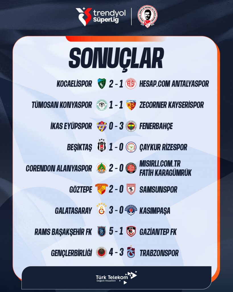 Spor Trendyol Süper Lig’de 17. hafta maçla ve puan durumu Yazar: Zirvem Gazetesi Aralık 23, 2025 Yazar: Zirvem Gazetesi Aralık 23, 2025 0 Yorumlar 0 Dakika Oku Paylaş 0FacebookTwitterPinterestTumblrVKWhatsappEmail 156 Paylaş 0 FacebookTwitterPinterestTumblrVKWhatsappEmail Zirvem Gazetesi Önceki Haberler Dışişleri Bakanı Hakan Fidan terör örgütü SDG’yi uyardı: next post MİT, terör örgütü DEAŞ’ın sözde yöneticilerinden Mehmet Gören’i Türkiye’ye getirdi Ayrıca Bu Haberlerede Bakabilirsiniz IFAD’ın “İlk Adım” devrimi Afrika’nın gıda geleceğini güvence altına alabilir mi? Mart 4, 2026 A Milli Basketbol Takımı, 2027 Dünya Kupası Avrupa Elemeleri’nde Sırbistan’ı yenerek 3’te 3... Şubat 28, 2026 Cumhurbaşkanı Erdoğan, GSB yurdu öğrencileri, sporcular ve gençlerle iftar programında bir araya geldi Şubat 27, 2026 Türkiye’nin doğum sancısı Şubat 23, 2026 Tanzanya, Doğu Afrika’nın ilaç merkezi olma yarışına göz dikmiş durumda Şubat 6, 2026 Aydın Şehir Hastanesi hizmete açıldı Ocak 25, 2026
