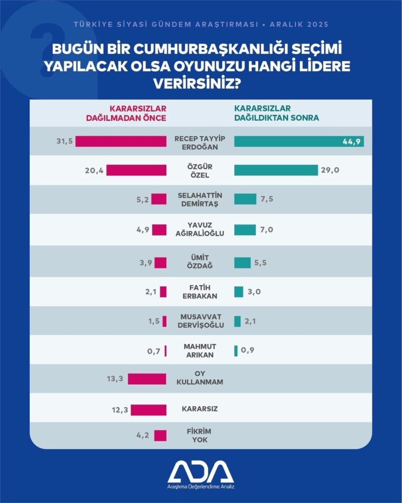 Siyaset ADA Araştırma Anketine Göre: Yavuz Ağıralioğlu Muhalefette Üçüncü Yolu Açabilecek Tek Lider Yazar: Zirvem Gazetesi Aralık 31, 2025 Yazar: Zirvem Gazetesi Aralık 31, 2025 0 Yorumlar 0 Dakika Oku Paylaş 0FacebookTwitterPinterestTumblrVKWhatsappEmail 169 ADA Araştırma’nın Aralık 2025 tarihli anketine göre Yavuz Ağıralioğlu, muhalif liderler arasında net biçimde ayrıştı. Anket sonuçları, Ağıralioğlu’nun Ümit Özdağ, Müsavat Dervişoğlu ve Fatih Erbakan’ı geride bırakarak, iktidar–ana muhalefet hattı dışında üçüncü yolu açabilecek tek lider olduğunu gösterdi. Bağımsız duruşu ve kutuplaşmadan uzak siyasetiyle Ağıralioğlu, kararsız ve küskün seçmen için güçlü bir alternatif olarak öne çıkıyor. Yöneylem Araştırma’nın anketine göre Anahtar Parti yüzde 6,9 oy oranına ulaşarak Zafer Partisi, İYİ Parti ve Yeniden Refah Partisi’ni geride bırakan Anahtar Parti, Türk milletinin umudu olma yolunda emin adımlarla ilerliyor. Paylaş 0 FacebookTwitterPinterestTumblrVKWhatsappEmail Zirvem Gazetesi Önceki Haberler Yavuz Ağıralioğlu’ndan yeni yıl mesajı: “Hissemize çocuklarımızın katilinin yeni yıl mesajını değerlendirmek düştü” next post Köprü ve otoyollara zam geldi Ayrıca Bu Haberlerede Bakabilirsiniz Cumhurbaşkanı Erdoğan, Antalya Diplomasi Forumu’nun açılışında konuştu Nisan 18, 2026 Cumhurbaşkanı Erdoğan, 152. Parlamentolar Arası Birlik Genel Kurulu onuruna verdiği akşam yemeğinde konuştu Nisan 17, 2026 Yavuz Ağıralioğlu: Devleti Muhafaza Etmeliyiz Nisan 15, 2026 Yavuz Ağıralioğlu: Kamuda Lale-Sülale Dönemine Son Vereceğiz Nisan 14, 2026 Cumhurbaşkanı Erdoğan: “Aile kurumunun ve ailevi değerlerin muhafazasını beka meselesi olarak görüyoruz” Nisan 14, 2026 MHP Genel Başkanı Bahçeli’den Netanyahu’ya sert tepki Nisan 14, 2026